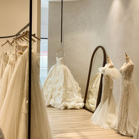 Where imperfection meets elegance. This creamy wabi-sabi bridal space whispers calm beauty and effortless charm, just like the brides who step into it. This creamy wabi-sabi bridal shop embraces calm through every surface, from texture paint to a sculptural partition that softens the space with grace. And the open hanging displays so each dress can breathe, flow, and shine in its own quiet elegance. because in a bridal shop like this, even the gowns are part of the story.